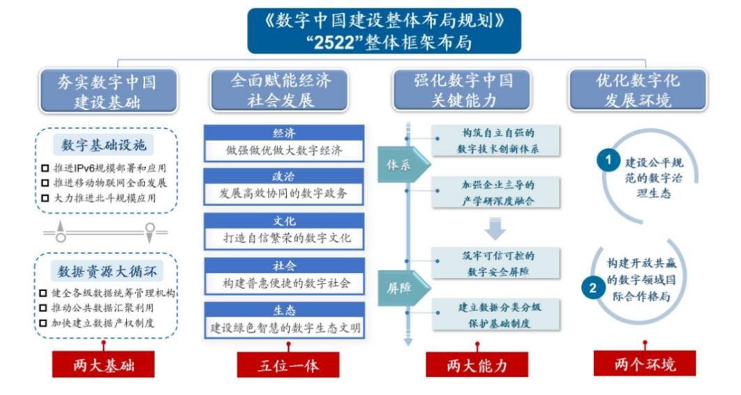 《规划》明确,数字中国建设按照“2522”的整体框架进行布局,即夯实数字基础设施和数据资源体系“两大基础”,推进数字技术与经济、政治、文化、社会、生态文明建设“五位一体”深度融合,强化数字技术创新体系和数字安全屏障“两大能力”,优化数字化发展国内国际“两个环境”。