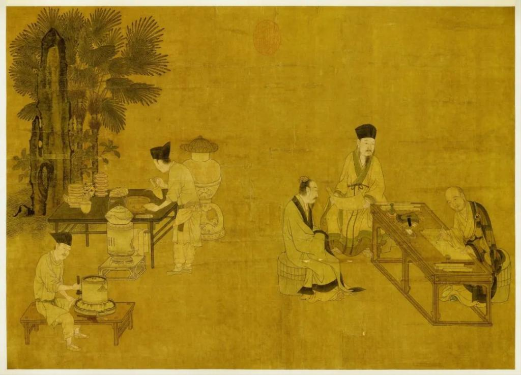▲南宋刘松年绘《撵茶图》,画中左侧茶事部分较全面地描摹了宋代点茶茶艺从磨茶、煮水到注汤点茶的过程。此图现藏于台北故宫博物院。