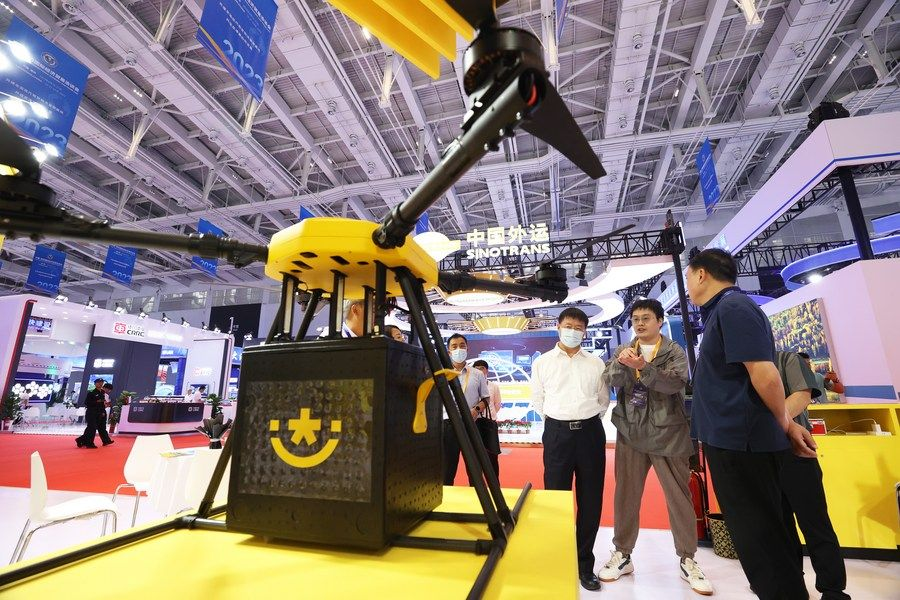 Hình ảnh: Hội chợ Kinh tế Thương mại Quốc tế Lang Phường Trung Quốc lần thứ 40, nhân viên đang giới thiệu máy bay vận chuyển không người lái trong khu vực Triển lãm Logistics thông minh, Trung tâm Hội nghị và Triển lãm Quốc tế Lâm Không Lang Phường, ảnh do phóng viên Jia Jun(Giả Quân)Tân Hoa xã chụp