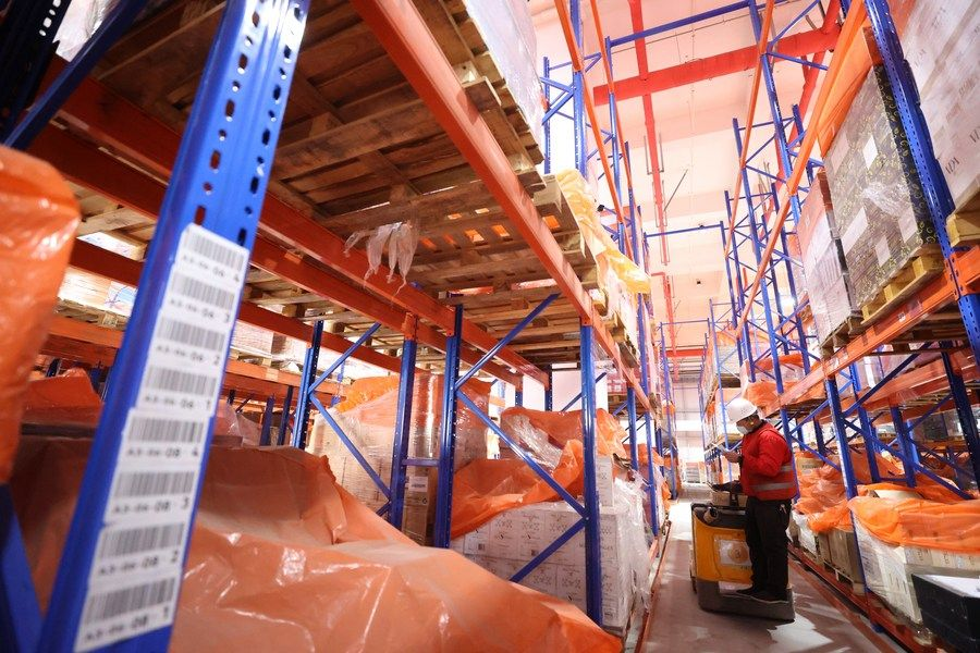 Hình ảnh: Bên trong kho hàng của trang web Wajiu.com ở kho số 1 khu ngoại quan tổng hợp tại Hà Bắc thuộc Sân bay Quốc tế Đại Hưng Bắc Kinh, công nhân đang kiểm tra tình trạng hàng hóa nhập kho, ảnh do phóng viên Jia Jun Tân Hoa xã chụp