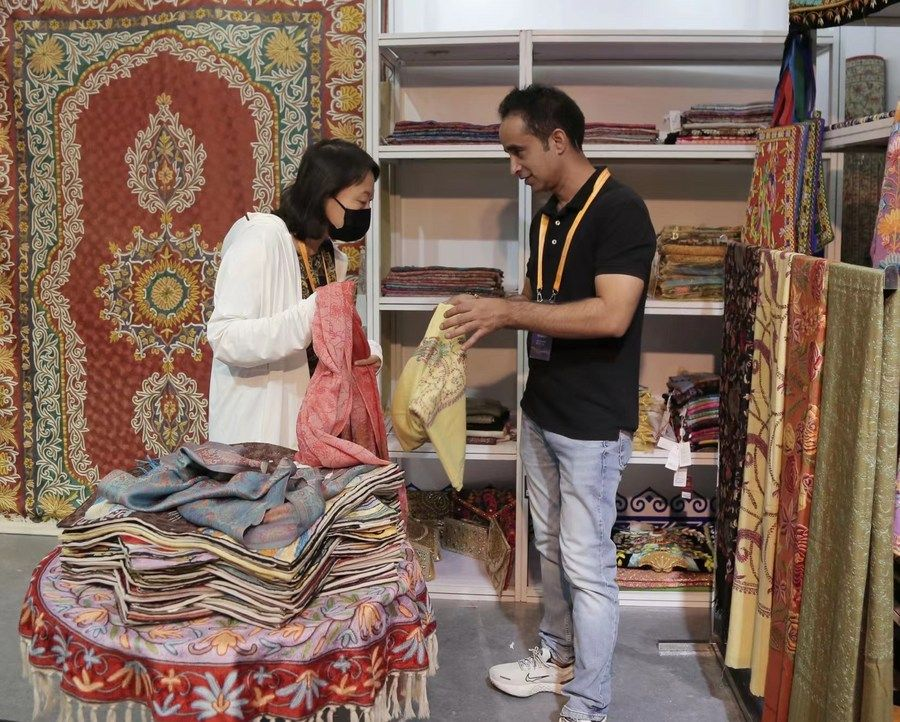 Hình ảnh: Hội chợ Kinh tế Thương mại Quốc tế Lang Phường Trung Quốc lần thứ 40, trong gian hàng Pakistan tại Trung tâm Hội nghị và Triểm lãm quốc tế Lâm Không Lang Phường, nhân viên đang giới thiệu sản phẩm tới khách hàng. ảnh từ Tân Hoa xã